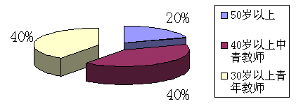 2、在教学队伍中有2人50岁以上,占教师队伍人数的20%;有4人40岁中青年教师,占教师队伍人数的40%;有4人是年轻教师,占教师队伍人数的40%。
