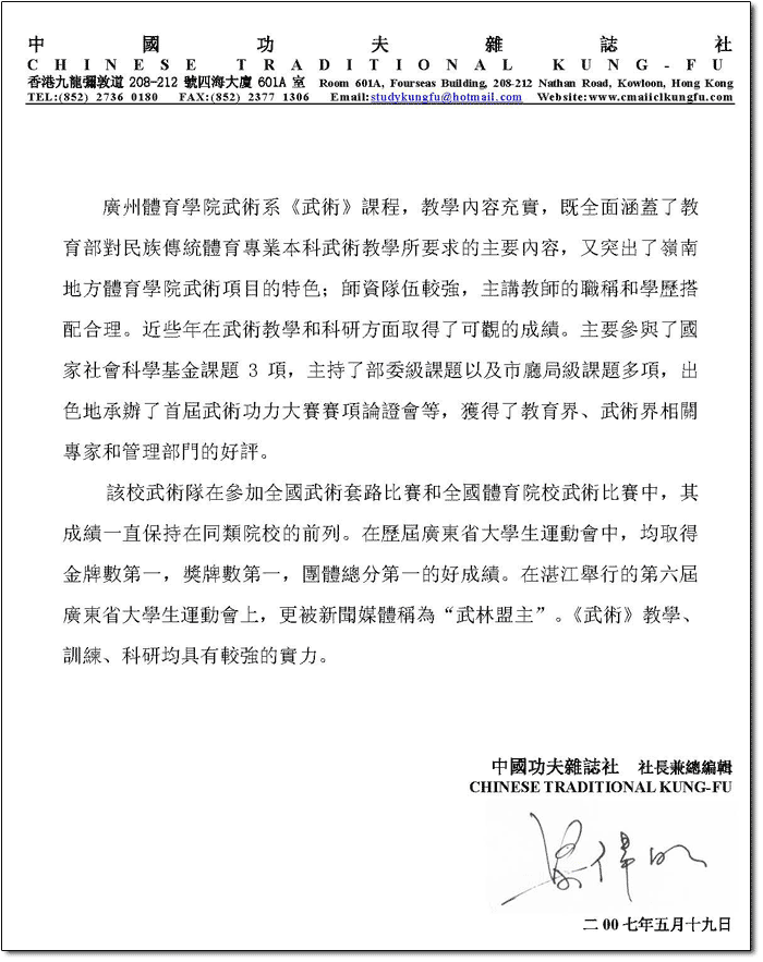 广州大学体育学院院长  刘学谦                            《中国功夫》杂志社社长兼总编辑  梁伟明